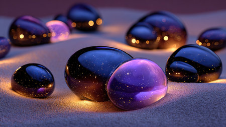 Purple glass stones on the sand. 3d render illustration.