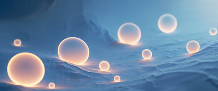 This captivating image features transparent spheres illuminated by blue light on a dark surface, symbolizing technology and interconnectedness in a futuristic setting.