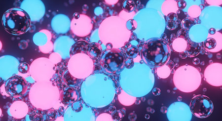 presents a dynamic and vibrant composition of numerous spheres and bubbles in pink and cyan hues. The spheres vary in size and translucency, with some emitting a soft glow and others reflecting the surrounding light. Tiny bubbles are visible within some of the larger spheres, adding a sense of texture and realism. The arrangement creates a sense of depth and movement, with a dark background that makes the illuminated stand out. The overall aesthetic is modern and abstract, evoking a feeling...