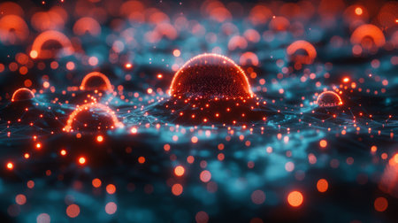 Glowing red spheres reflecting on wet surface with bokeh lights, futuristic atmosphere. Modern technology and innovation concept