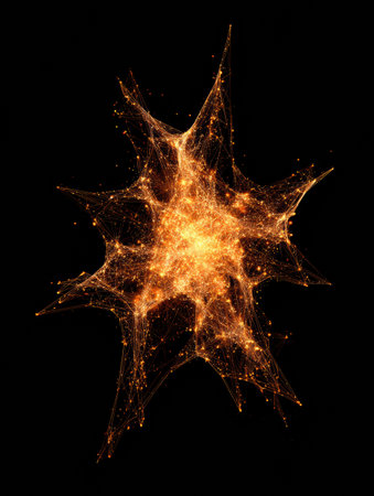 Intricate structure of glowing nodes and lines forms a star shape, showing a blend of light in a dark setting, emphasizing beauty in complexity.