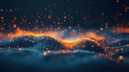 This abstract image showcases a glowing wave of particles shimmering against a dark background, evoking a sense of beauty and fluidity in digital art.