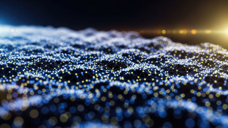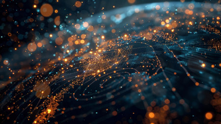 An abstract digital landscape is depicted with a focus on interconnected particles. The image showcases a network of glowing points, primarily in shades of blue and white, set against a dark background. Bokeh effects and a subtle light source enhance depth and visual interest. Suitable for technology, data, and design projects.