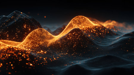 Bright golden waves flow across a textured dark landscape at twilight, creating a mesmerizing visual effect. This enchanting scene showcases a blend of light and shadow.