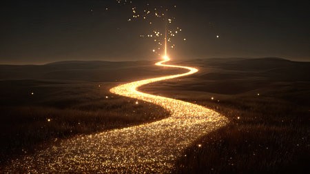 This image features a glowing golden pathway winding through darkness, adorned with sparkling particles, creating an enchanting atmosphere filled with warmth.
