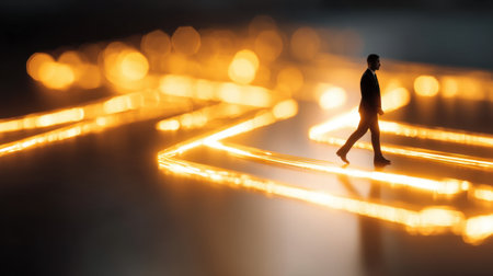 Businessman walks along glowing path, symbolizing progress and innovation. warm light creates sense of optimism and direction in modern, abstract setting