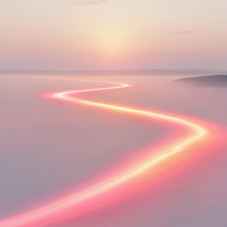 A winding, glowing light trail in shades of pink and yellow cuts through a misty landscape at sunrise or sunset.