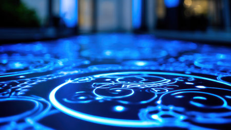 Close-up of a glowing blue surface etched with intricate patterns and designs