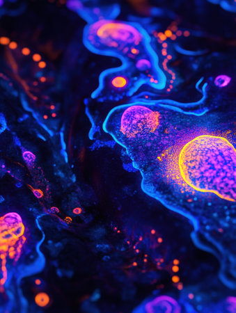 Under ultraviolet light, glowing bacteria illuminated in various colors, showcasing intricate patterns and bright hues in a dark setting.