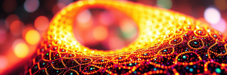 Vibrant patterns and textures created with colorful beads under warm lights showcase intricate craftsmanship and artistry