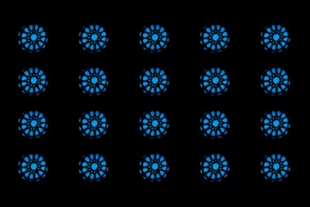Twenty blue lights in the shape of an abstract circles on a black background.