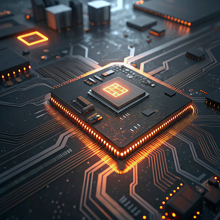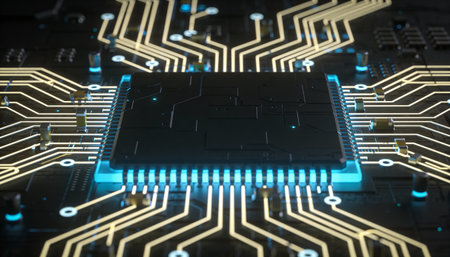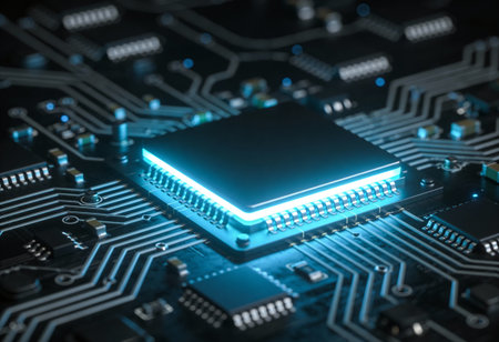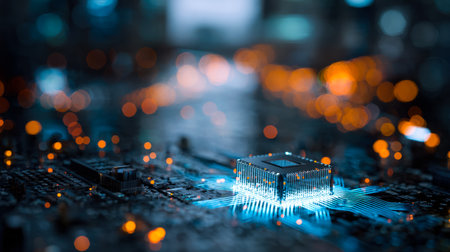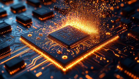 A microchip is centrally positioned on a circuit board, surrounded by luminous pathways and intricate designs.