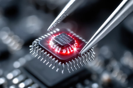 A microchip with glowing features is being carefully lifted by tweezers in a clean lab environment.