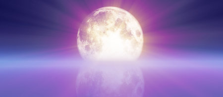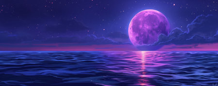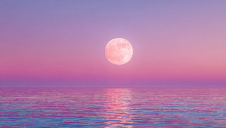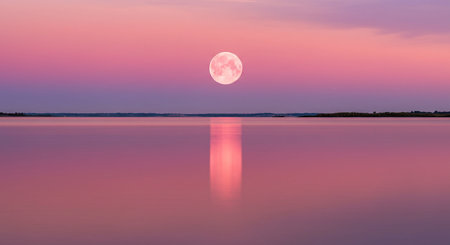 A large, luminous full moon dominates the central composition, reflecting on the tranquil water below. The image showcases a gradient sky transitioning from shades of purple to pink. The scene suggests a serene, outdoor environment, possibly at dusk or dawn. This imagery would be suitable for various commercial or editorial uses.