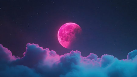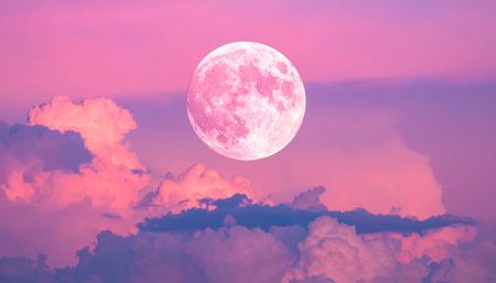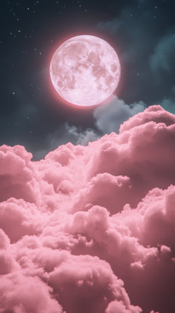 A stunning pink moon illuminates fluffy clouds against a starry night sky, creating a captivating and dreamlike atmosphere perfect for artistic and creative inspiration.