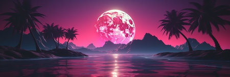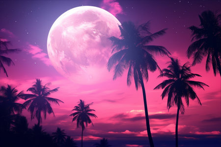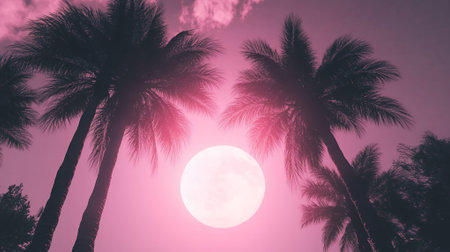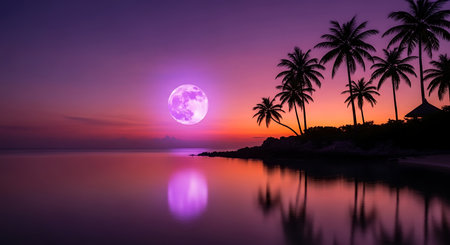 A large pink moon sets over a tranquil tropical beach with palm trees, creating a dreamy and surreal scene.