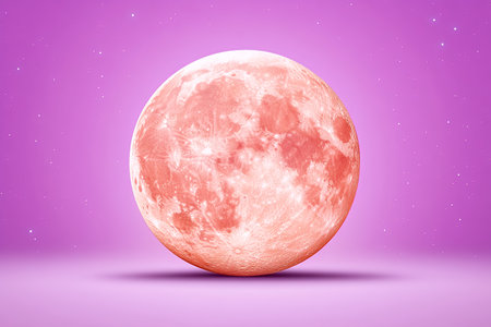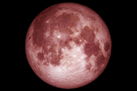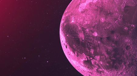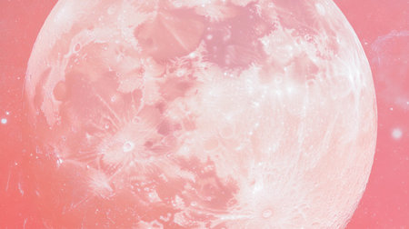 Pink full super moon glowing with pink halo surrounded by stars on black sky background