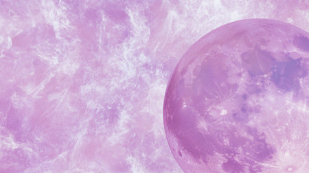 Pink moon in pixel art style on a purple background with glowing stars, creating a dreamy and surreal atmosphere. The moon is a stylized, textured sphere with a pink hue and a speckled, glittery effect. The background is a solid, gradient purple, softly lit, suggesting a studio setting.