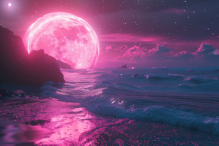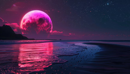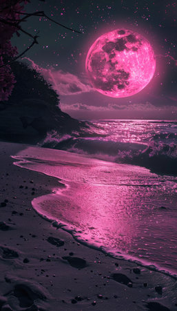 A pink moon illuminates a dark and serene beach scene, casting a glow on the water and sand.