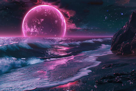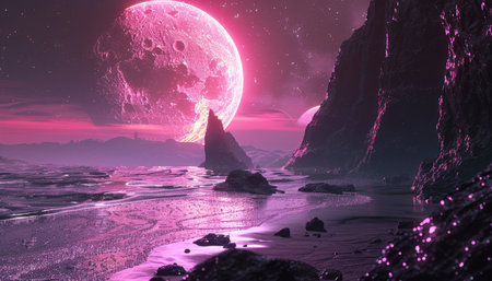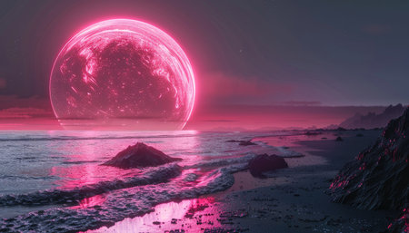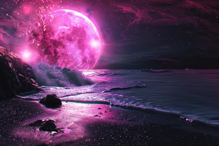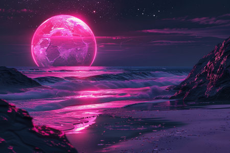 A digitally rendered image depicting a glowing pink planet rising over a dark sea and sandy shore, set against a night sky filled with stars.