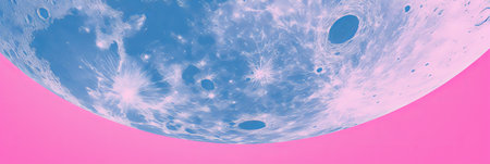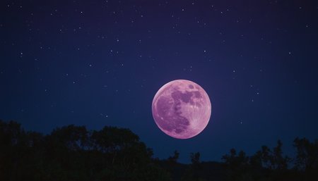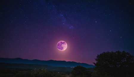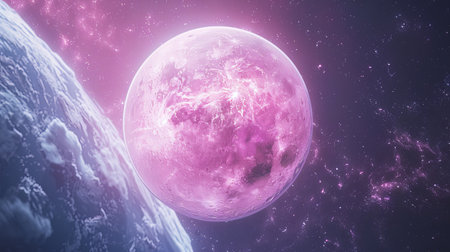A stunning view of a pink moon rising over Earth's horizon, with the celestial body glowing against a backdrop of stars and nebulae.