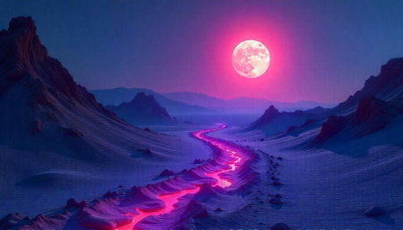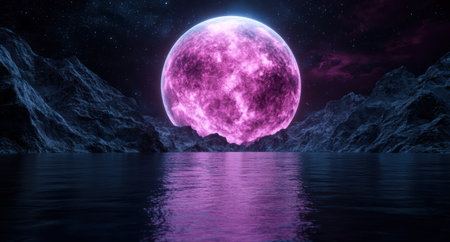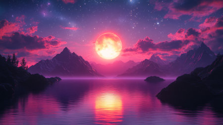 Serene landscape with glowing pink moon over tranquil lake and mountains