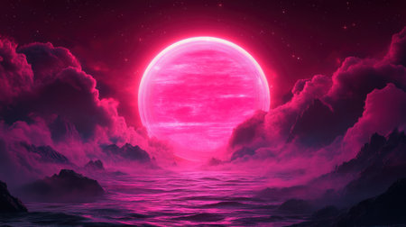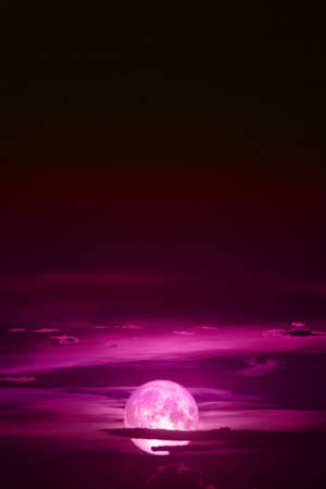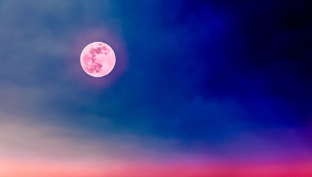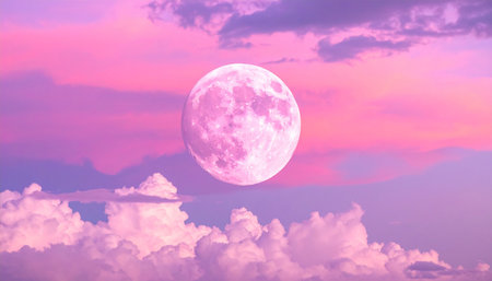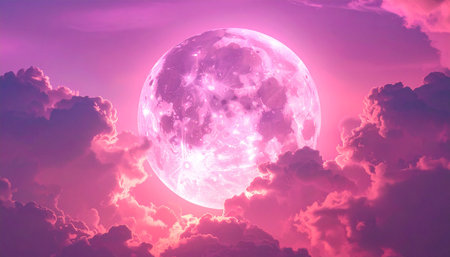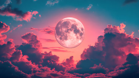 Full moon over pink clouds at night, dreamlike skyscape. Fantasy celestial concept