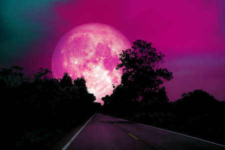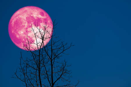 Full Crust pink Moon and silhouette tree in the field and night sky,