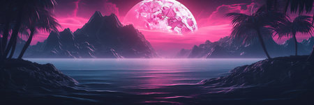 Fantasy landscape with pink full moon over the sea. 3d illustration