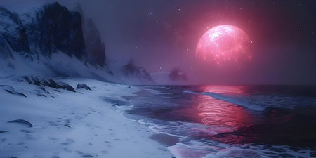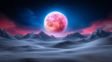A vibrant landscape showcases a massive pink moon casting its glow on a softly undulating snowy expanse, framed by towering, rugged mountains under a colorful twilight sky. Generated AI