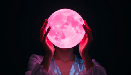 A woman is holding a glowing pink ball in her hands. The ball is shaped like a moon and he is glowing in the dark. The image has a mysterious and ethereal mood