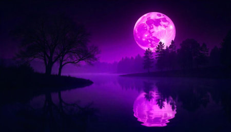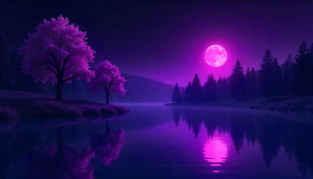 Purple moonlight reflecting on calm lake with silhouettes of trees