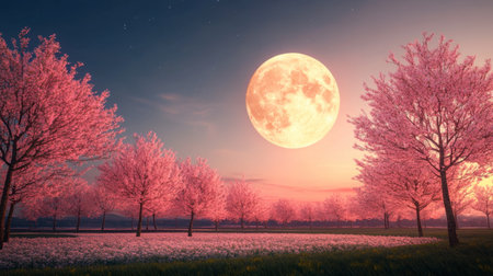 A serene landscape featuring blooming cherry trees under a vibrant full moon, creating a magical atmosphere that captures the beauty of spring nights.