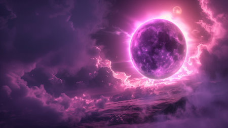 Witchy and cyberpunk style illustration of a solar eclipse moon with pastel pink and purple tones. dark and mysterious background. neon lighting. By generative Ai