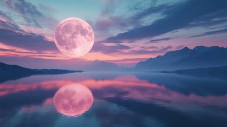 A captivating twilight scene featuring a vibrant full moon casting its reflection on still water, framed by majestic mountains and soft clouds, creating a peaceful atmosphere.