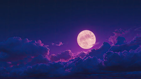 A radiant full moon illuminates the night sky, contrasting against dark, layered clouds. The scene exhibits a vivid color palette, with deep blues and purples. Ideal for visual media, the image offers a sense of mystery and wonder, suitable for various editorial and commercial applications. The composition features a clear, centered subject.