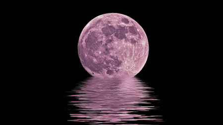 A full, pink-toned moon is centered in the frame, reflecting in the rippled water below. The image features a dark, black background, enhancing the moon's illuminated sphere and its reflection. The lighting suggests a night scene. This image could be used for various editorial and design purposes.