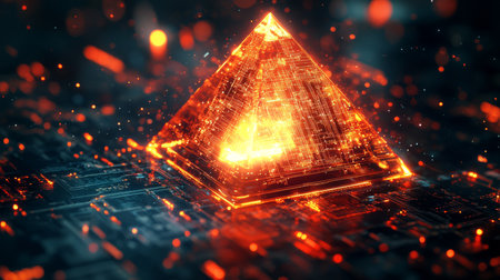 Glowing digital pyramid hologram emerging from futuristic microchip circuitry