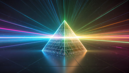 A colorful pyramid stands in a dark space, emitting beams of light in various hues.