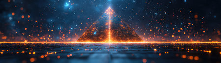 Glowing pyramids on a dark, textured surface create a mystical atmosphere in a digital landscape filled with sparks. Generative AI