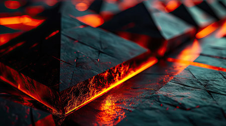 Abstract geometric landscape with dark polygonal shapes illuminated by glowing orange lines and golden particles.