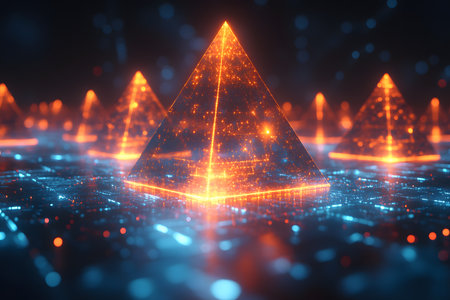 A stunning digital representation of a futuristic pyramid with glowing elements surrounded by a surreal bokeh effect, perfect for technology and abstract themes.