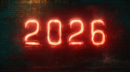 A vibrant neon light display of the year 2026 against a dark brick wall, perfect for bringing a modern and artistic touch to various creative projects.