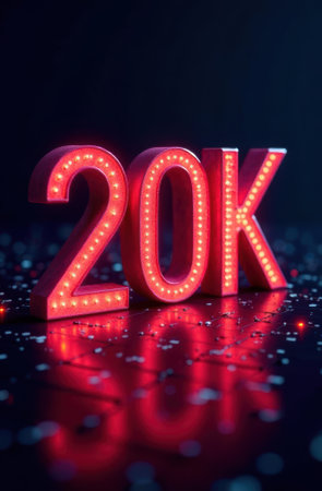 Red illuminated letters forming the number 20k stand on a reflective surface, surrounded by confetti, celebrating reaching twenty thousand followers on social media