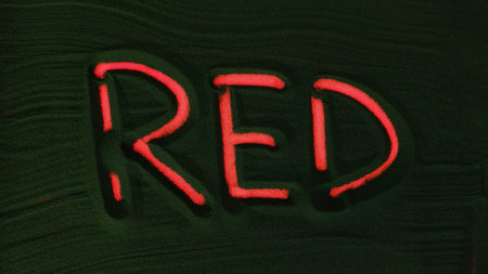 Hand drawing the Word Red in the Green Sand. Male hand writes the word Red on the green sand with red backlight. Top view 4k resolution