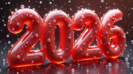 Shiny red 2026 numerals with bubbles on a reflective dark surface, symbolizing celebration and the new year concept