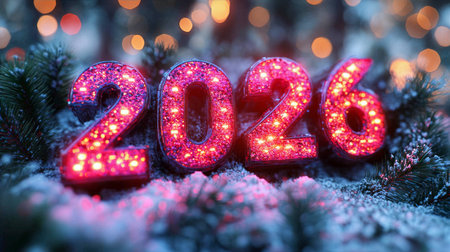 Colorful illuminated numbers 2026 on snow-covered ground with festive lights celebrating new year concept