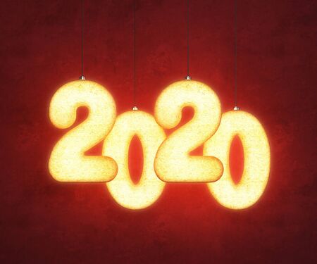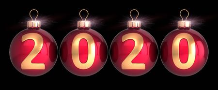 New 2020 Year's Eve Christmas balls decoration red with golden calendar date numbers double twenty. Merry Xmas greeting card design element. 3d rendering over black