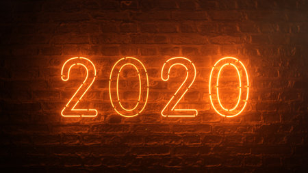 2020 fire orange neon sign background new year concept. Happy New Year. Brick background. Flicker light. 3d illustration