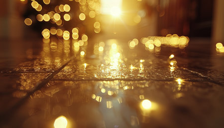 Close-up view of a wooden floor with string lights laying on it. The lights create a warm glow with a blurred background of more lights and a festive setting.